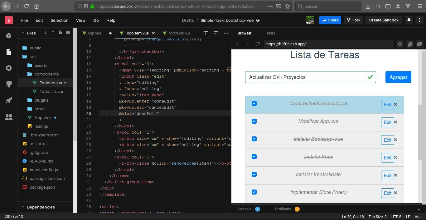In this project, I implement Vuex, the official state management solution for Vue, to manage the state throughout my app made up of only three components. These are structured with Bootstrap-Vue 2 (Bootstrap 4.5) and the task entry form is validated with VeeValidate 3, whose API changes radically compared to version 2.